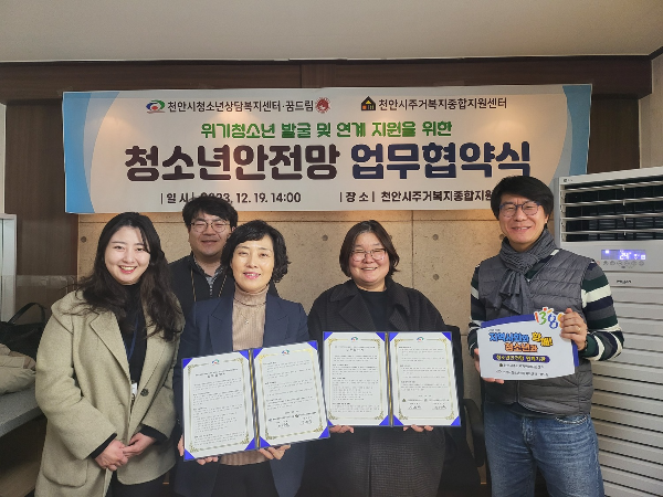 본 센터는 천안시 청소년(가정)의 건강한 성장지원을 위하여 천안시청소년상담복지센터와 2023년 12월 19일 업무협약을 체결하였습니다.