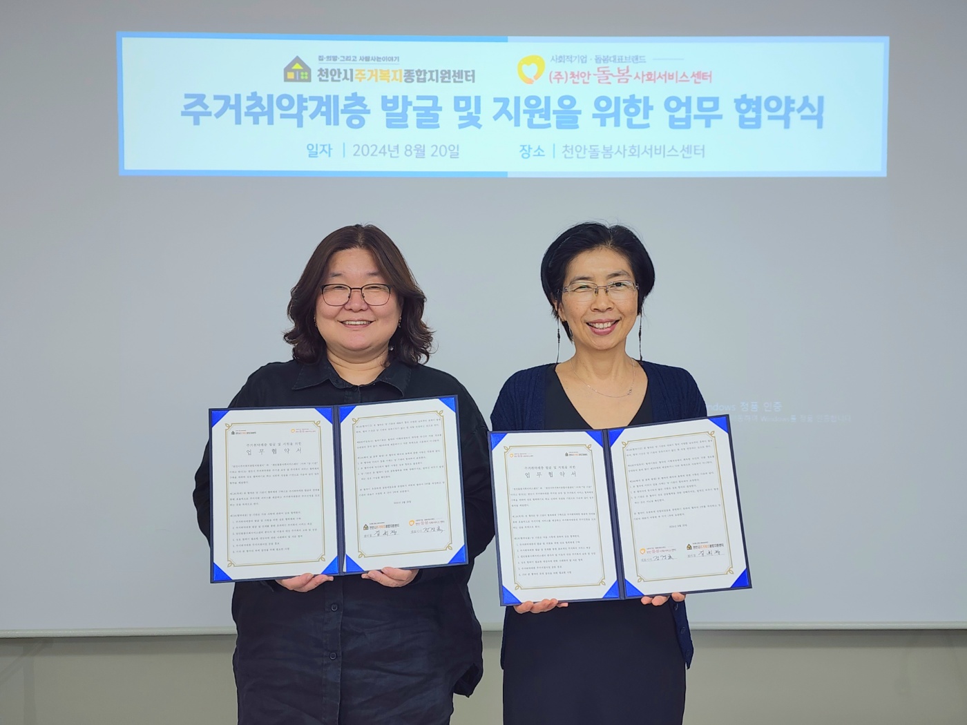 저희 센터는 8월 20일(화) 천안돌봄사회서비스센터와 주거취약계층 발굴 및 지원을 위한 업무협약을 체결하였습니다.