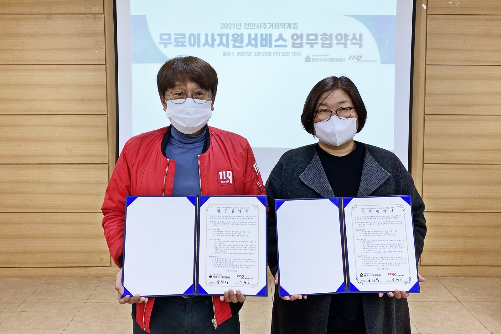 천안시주거복지종합지원센터와 119익스프레스의 주거취약계층 무료이사지원서비스 업무협약 체결 기사입니다.
