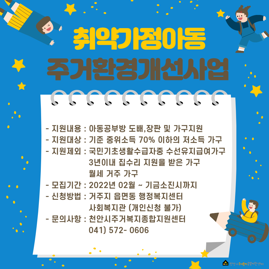 - 아동방환경개선 : 도배, 장판, 단열, 창문, 책상, 수납장, 침대 등( 물품 지원은 환경개선사업과 함께 지원되며 별도 지원은 불가)