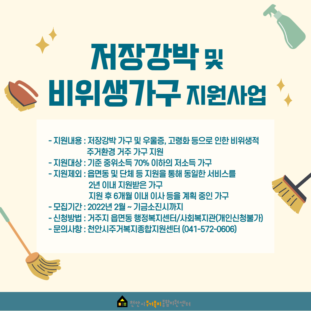 ○ 사업목표 : 저장강박 가구 및 우울증, 장애, 고령지워화 등으로 인한 비위생적 주거환경 거주 가구의 지원을 통한 주거환경 개선 도모