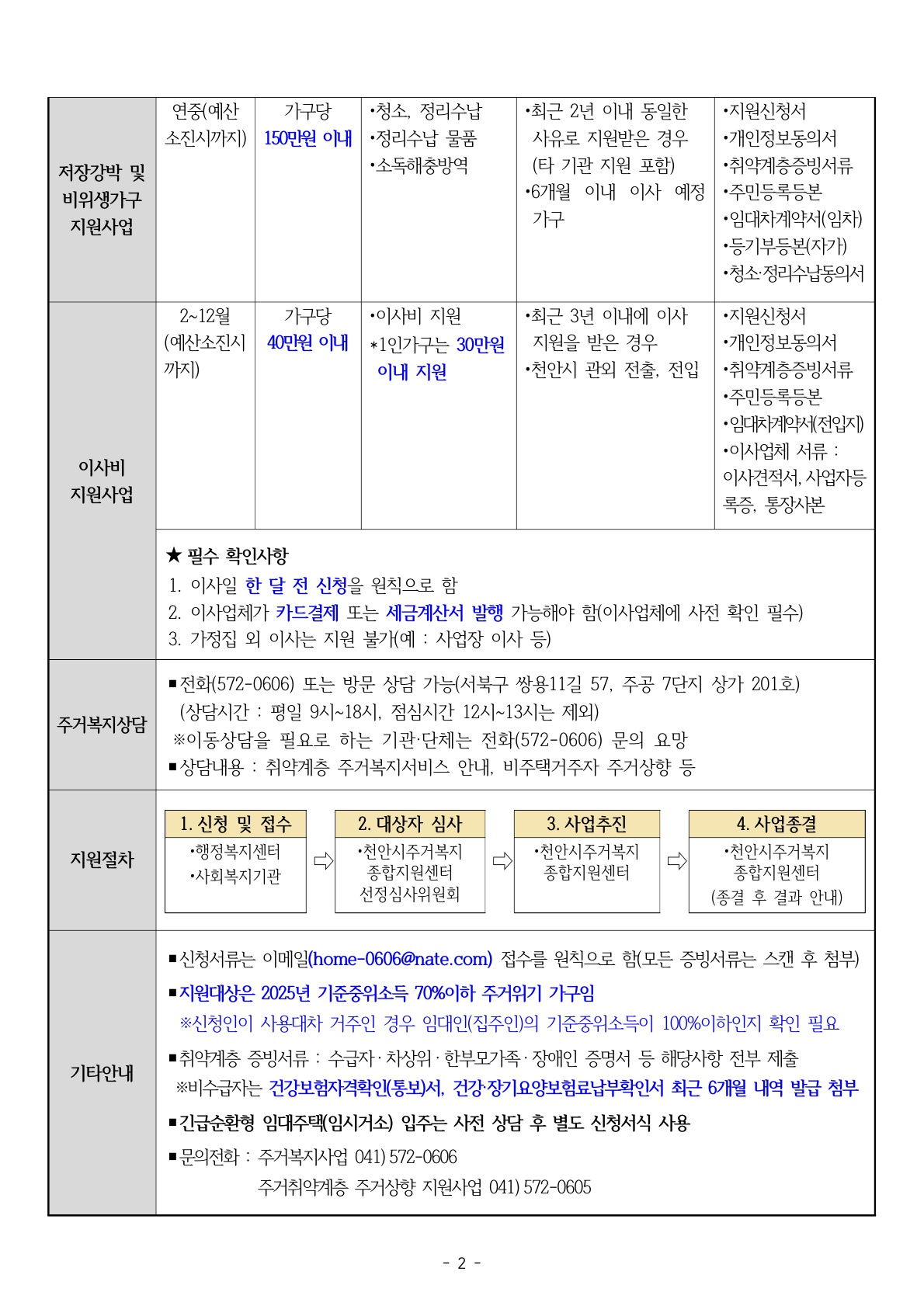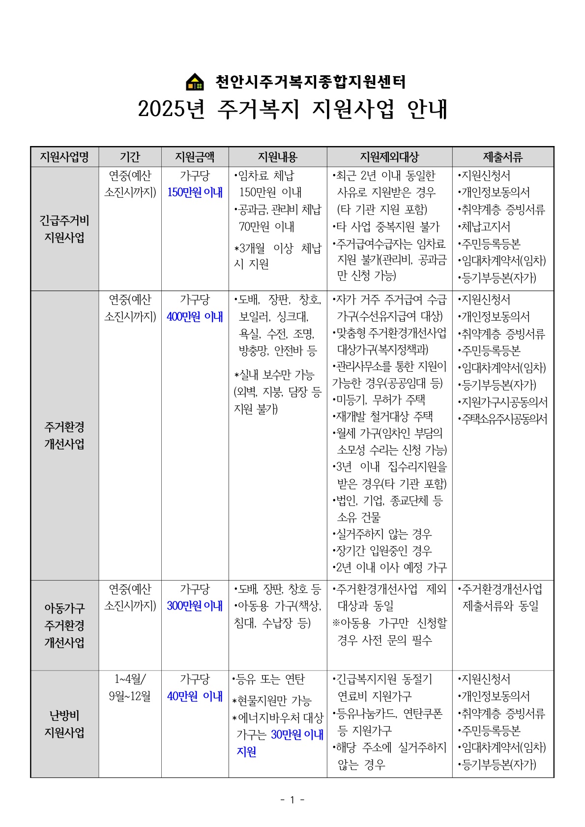 천안시주거복지종합지원센터의 2025년 주거복지 지원사업을 아래와 같이 안내드립니다.