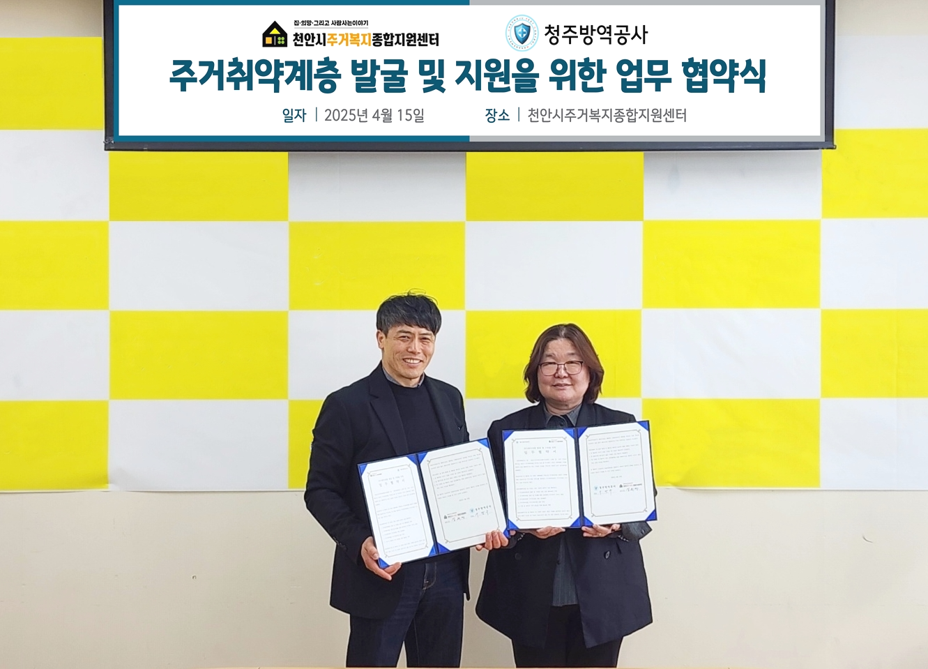 천안시주거복지종합지원센터(센터장 김희정)와 청주방역공사(대표 구장우)는 4월 15일(화) 주거취약계층 발굴 및 지원을 위한 업무협약을 체결하고 향후 지역사회 취약가구 위생 개선을 위해 상호 협력하기로 하였습니다.